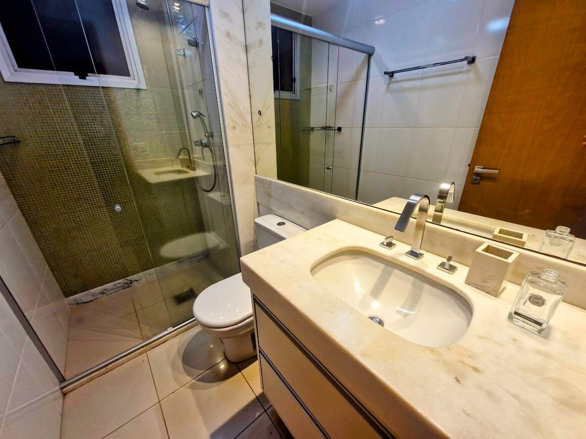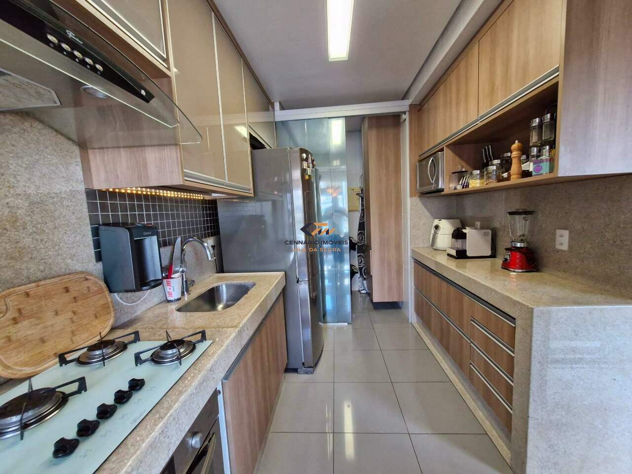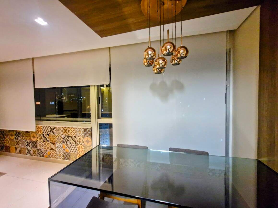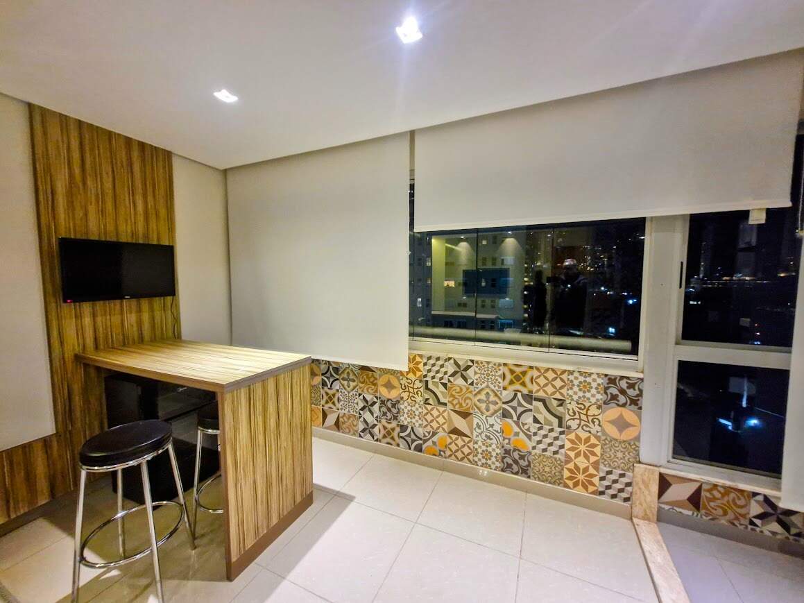 Apartamento: Sala para dois ambientes, piso em porcelanato, varanda gourmet, 02 quartos com armários, sendo 1 suite, piso em laminado. Banho social e suite com piso e bancada em mármore, armários, box, espelhos,Cozinha americana com armários, Área de serviço.