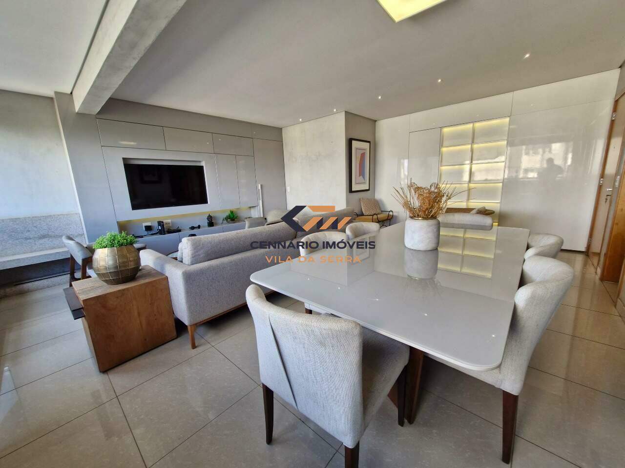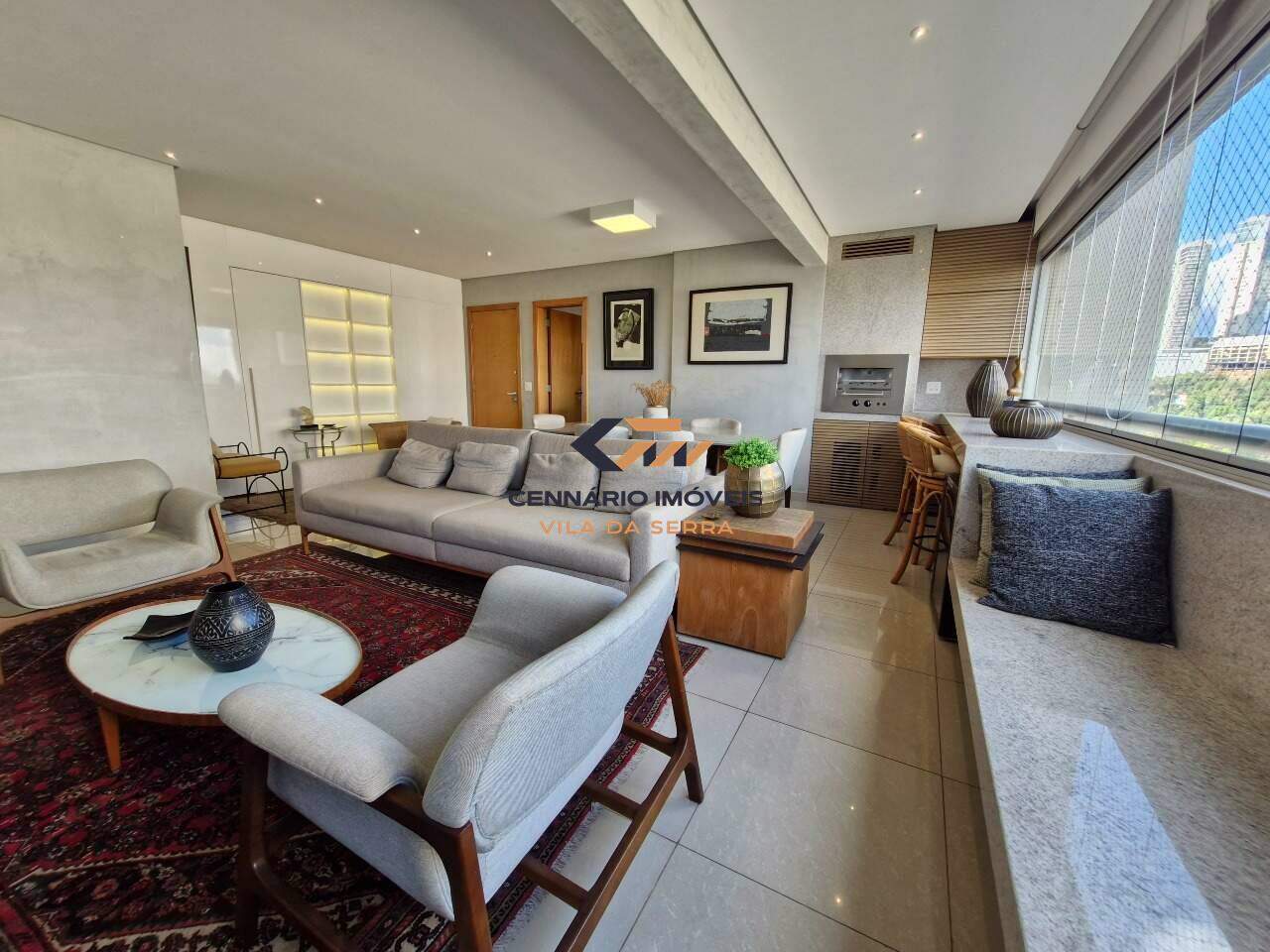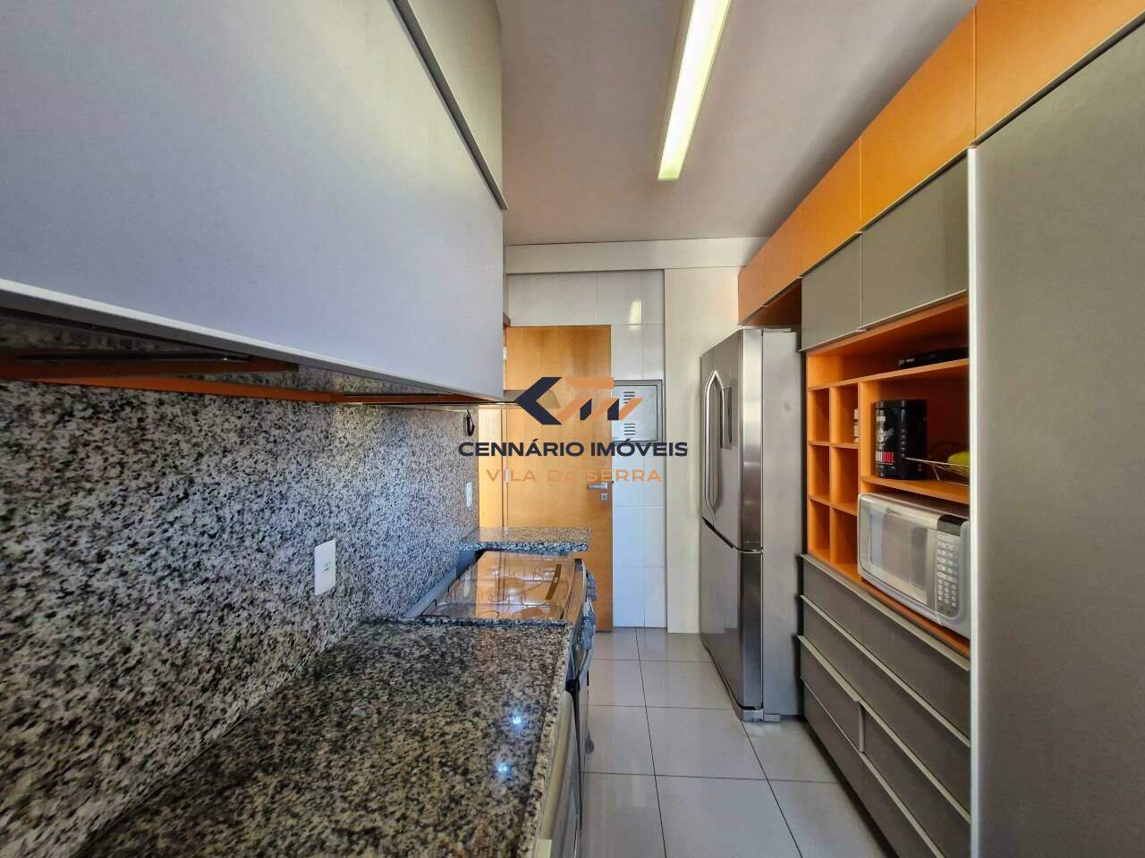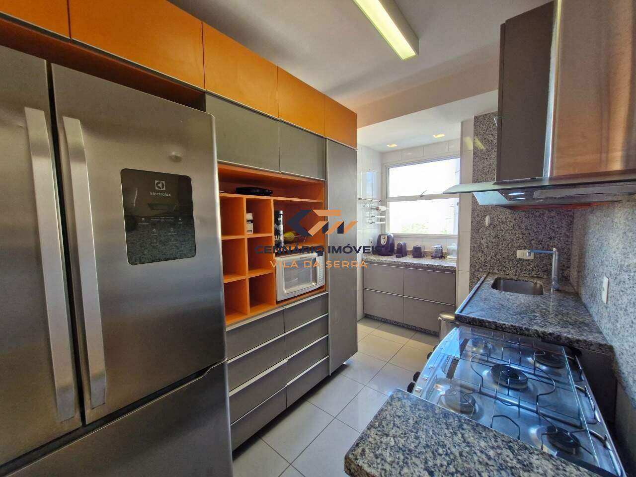 Apartamento de 3 quartos à venda no Edificio Cennario localizado no Vila da Serra em Nova Lima - MG. Prédio: Fachada revestida em textura mineralizada com detalhes em cerâmica, hall social decorado, portaria 24 horas, quadra poliesportiva, quadra de tênis, piscinas adulto e infantil, salão de jogos, fitness, espaço gourmet, lounge, brinquedoteca, praças, mirantes, espaço zen, spa, jardins, gazebo gourmet, petplay, 02 vagas de garagem livres, box de despejo. Apartamento: Sala para 2 ambientes com piso em porcelanato, teto rebaixado com projeto de iluminação, varanda gourmet com churrasqueira. Lavabo. 03 quartos com armários, sendo 1 suíte com closet amplo, piso em laminado. Banho social e suíte com armários, box, espelhos, pisos e bancadas em mármore, Cozinha com armários, piso e bancada em granito, Área de serviço, banho de empregada. OBS: EXCELENTES ARMÁRIOS TODOS EM LAKA, CHURRASQUEIRA A GAS.